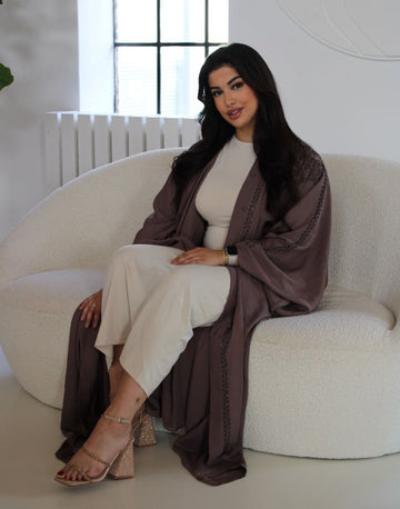 Brown Azmira Abaya Graceful. Luxe. Timeless. This elegant abaya in a brown shade is finished...