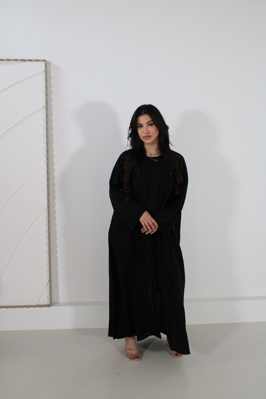 Finished with elegant black stone embellishments along the sleeves and front, the Noora Abaya transitions effortlessly from day to evening. .