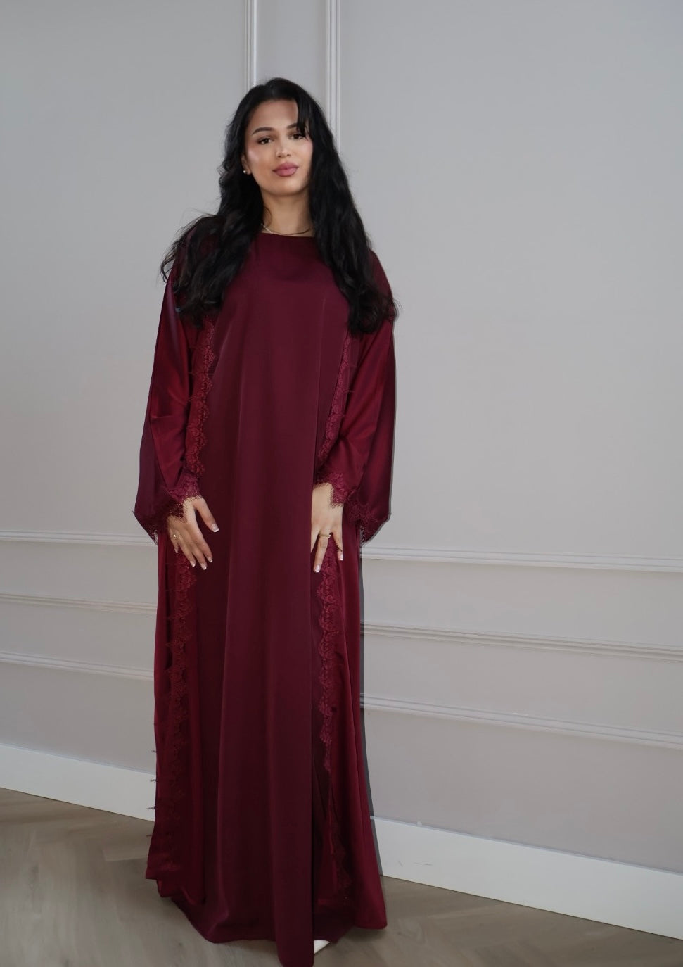 The Noir Bloom Abaya is designed in a deep, rich dark-red tone a truly unique shade that immediately stands out. An exclusive in-house design.