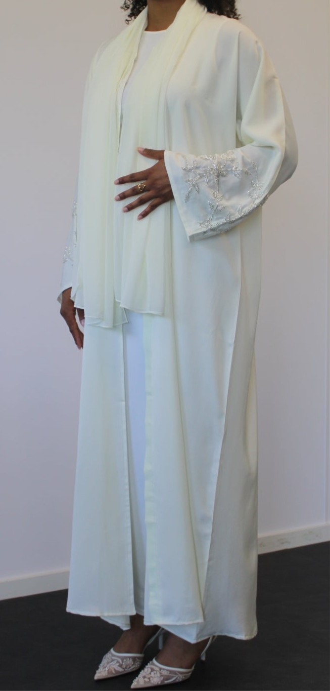 Zahra Abaya 🌼 In a soft light yellow shade, this abaya features subtle silver stones...