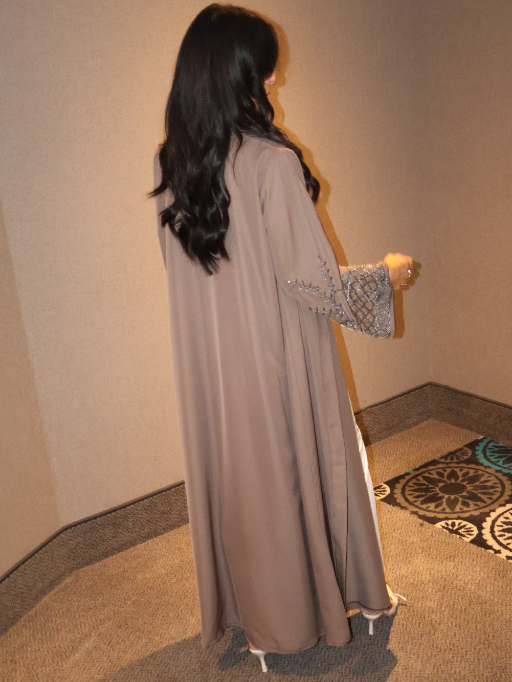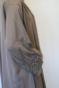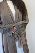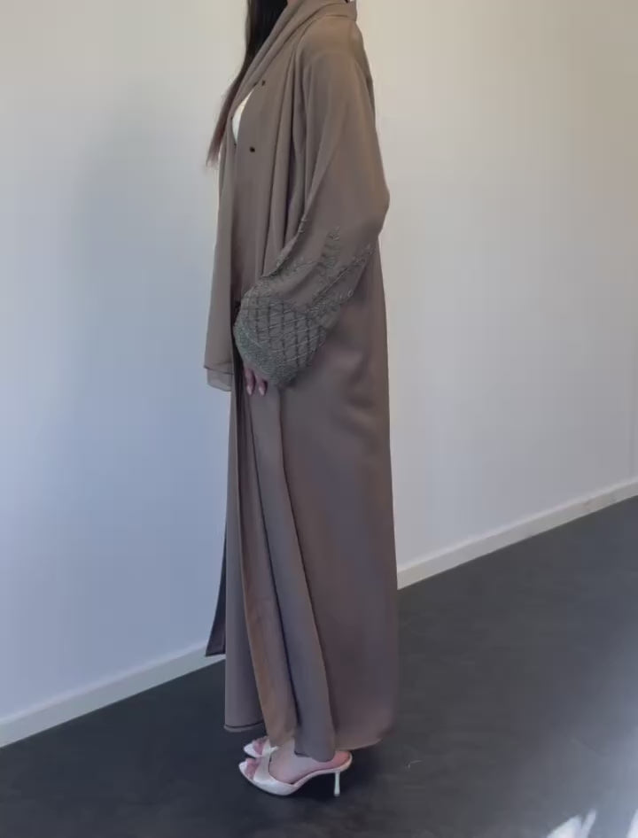 This elegant abaya in a brown shade is finished with luxury stones on the sleeves Perfect for elevating your look, whether for a special occasion or simply to refine your everyday style.