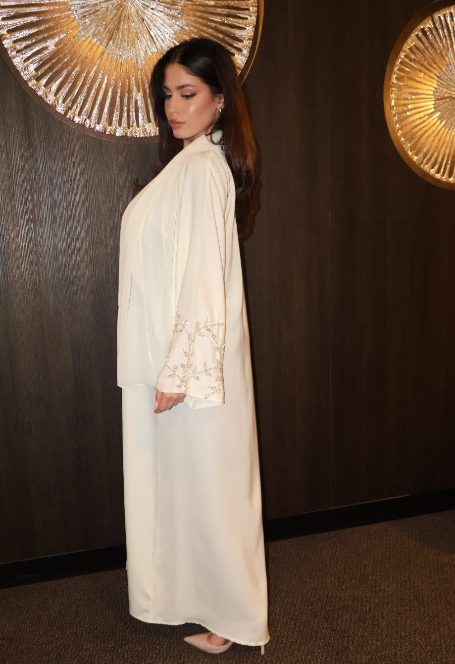 In a soft light yellow shade, this abaya features subtle silver stones on the sleeves. Elegant for special occasions or everyday chic.